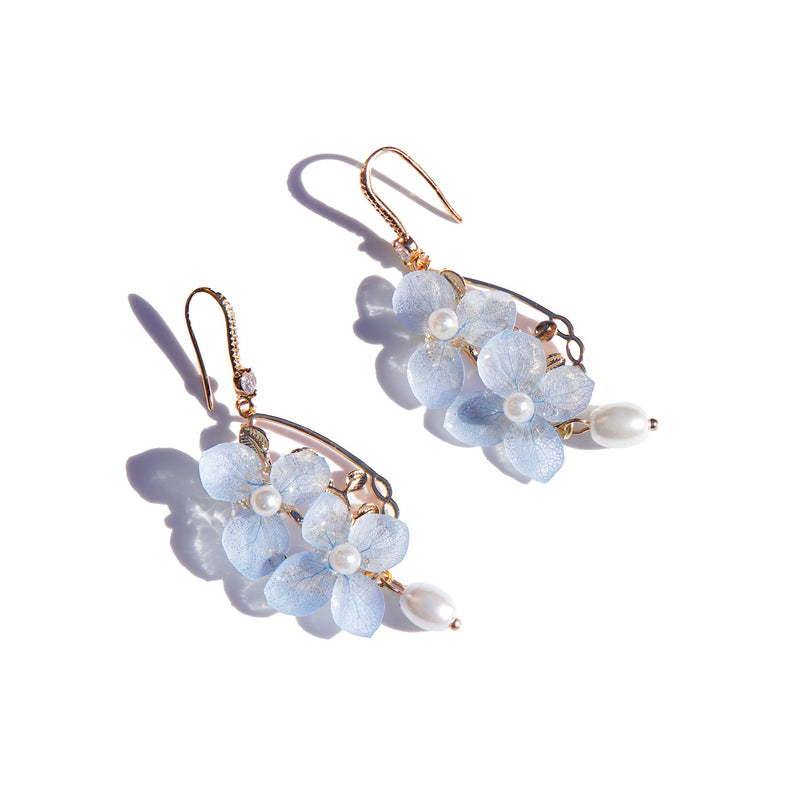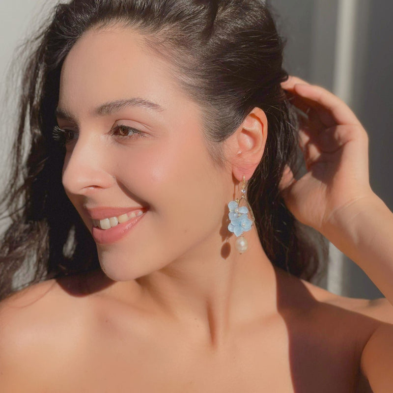 *Real Flower* Blue Hydrangea Pearl Drop Earrings