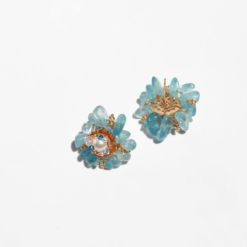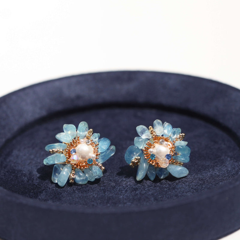 Dive into elegance with these Ocean Bloom Aquamarine & Pearl Stud Earrings. Featuring natural aquamarine petals and a luminous pearl center, each pair is delicately handcrafted with golden accents and tiny crystals, perfect for adding a refreshing touch of ocean-inspired charm.
