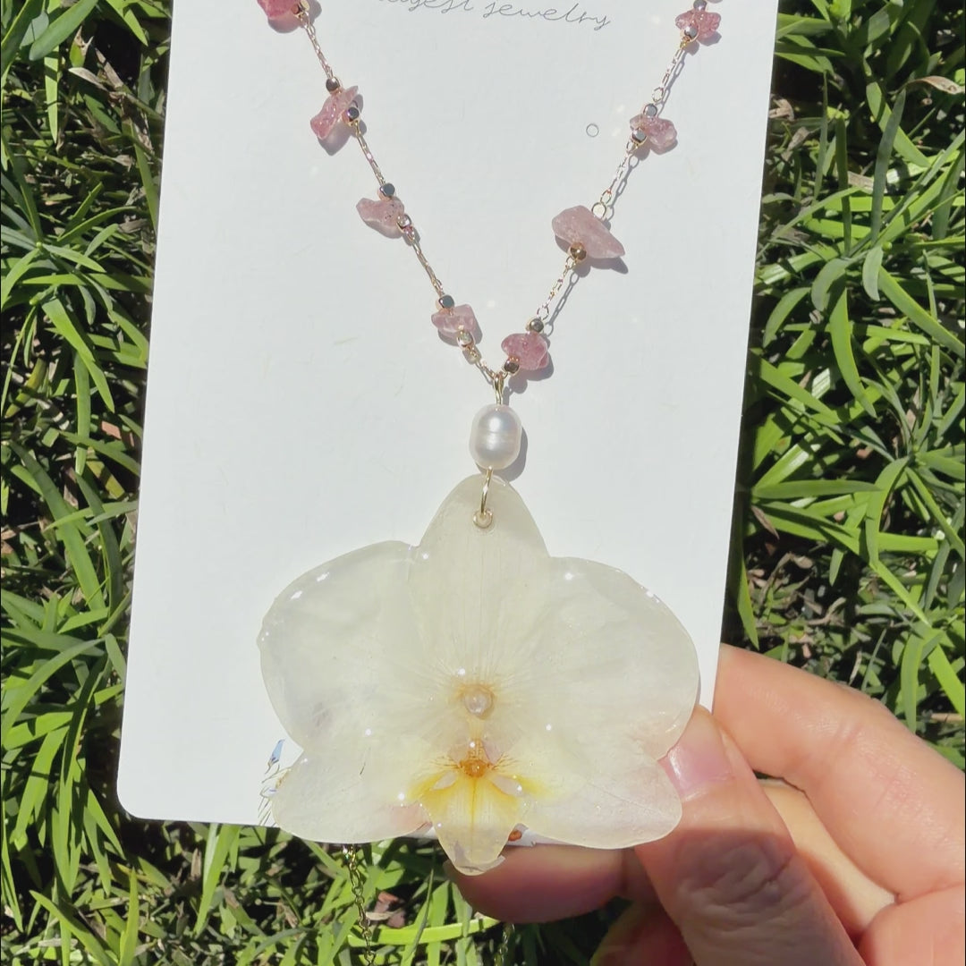Complete your set with the matching white Orchid Necklace. This stunning pendant features an iconic statement orchid flower, meticulously handmade from a real orchid and perfectly preserved. For a touch of elegant movement, delicate pearls are suspended at the bottom of the bloom. It hangs from a delicate chain, creating a unique centerpiece that can be worn alone or with the matching earrings.